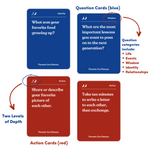 These cards prompt stories and conversations around Life Events, Wisdom, Identity, and Relationships.