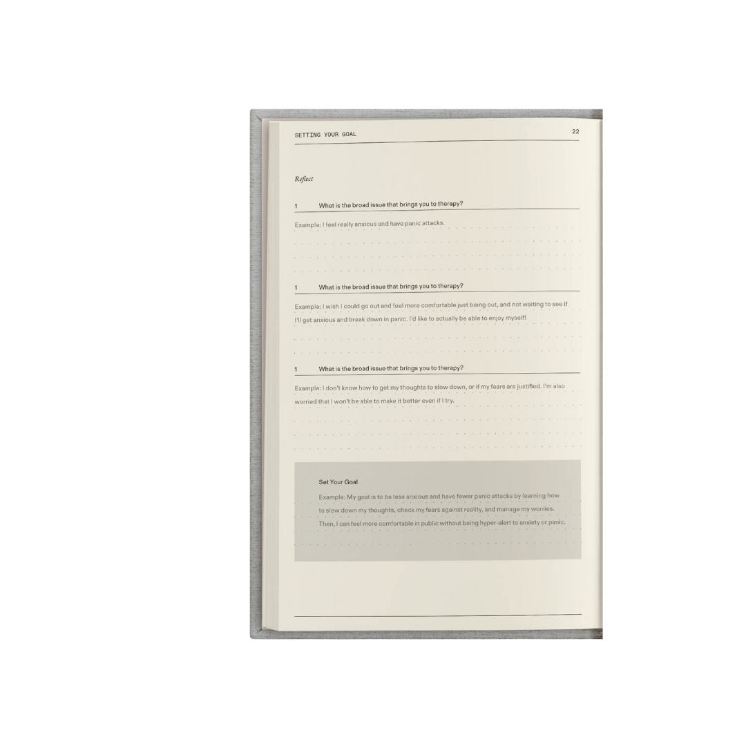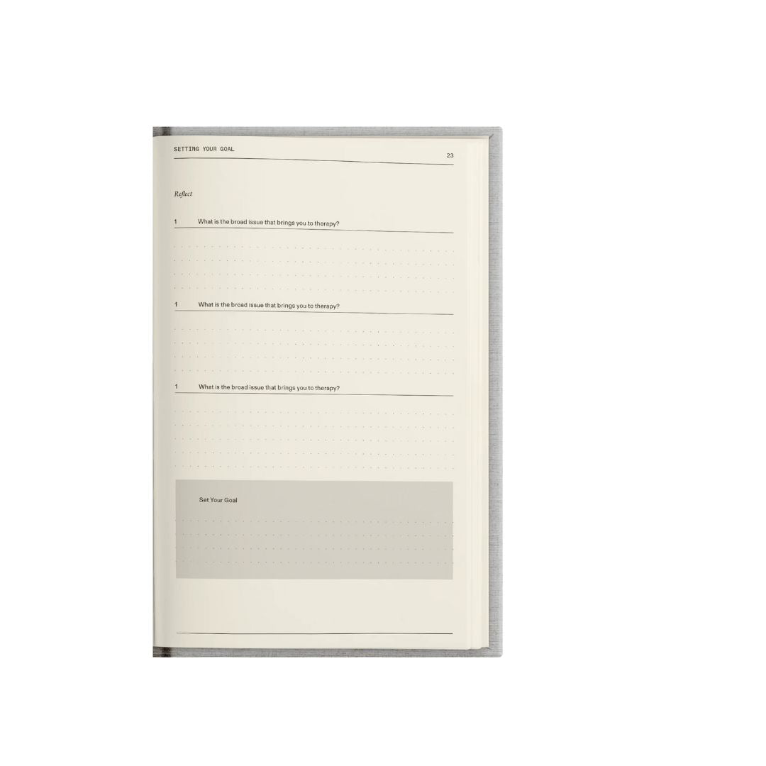 • This notebook equips you with the structure and space to get the most out of your sessions. You'll organize your thoughts to prepare for sessions, keep track of insights, and be empowered as an active participant of your growth journey.