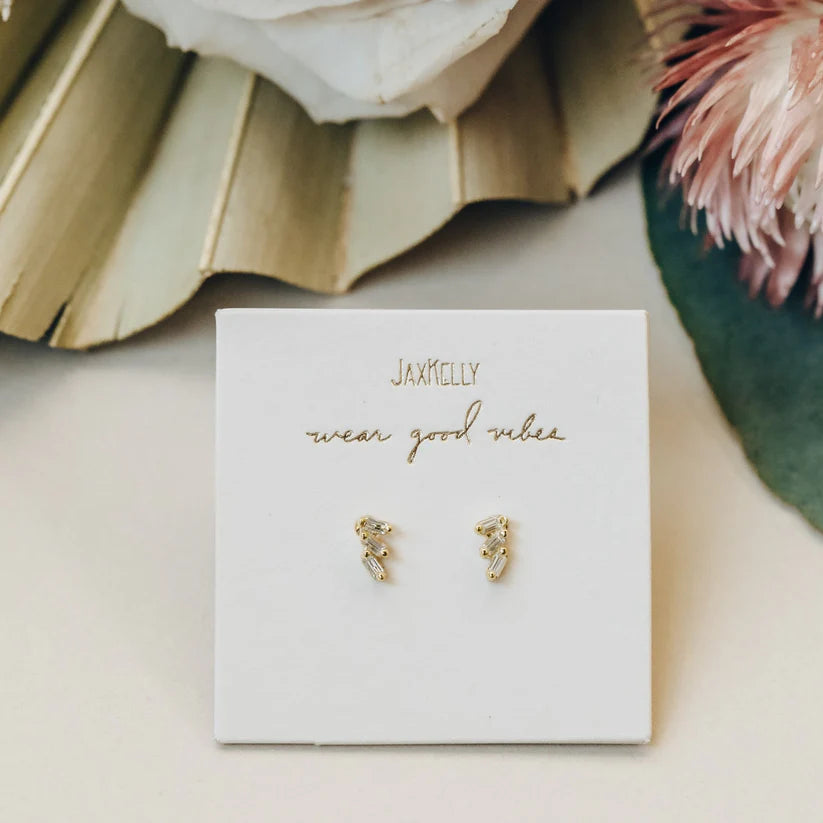 Three white CZ stones are set in a delicate prong, with a slight offset between each stone.