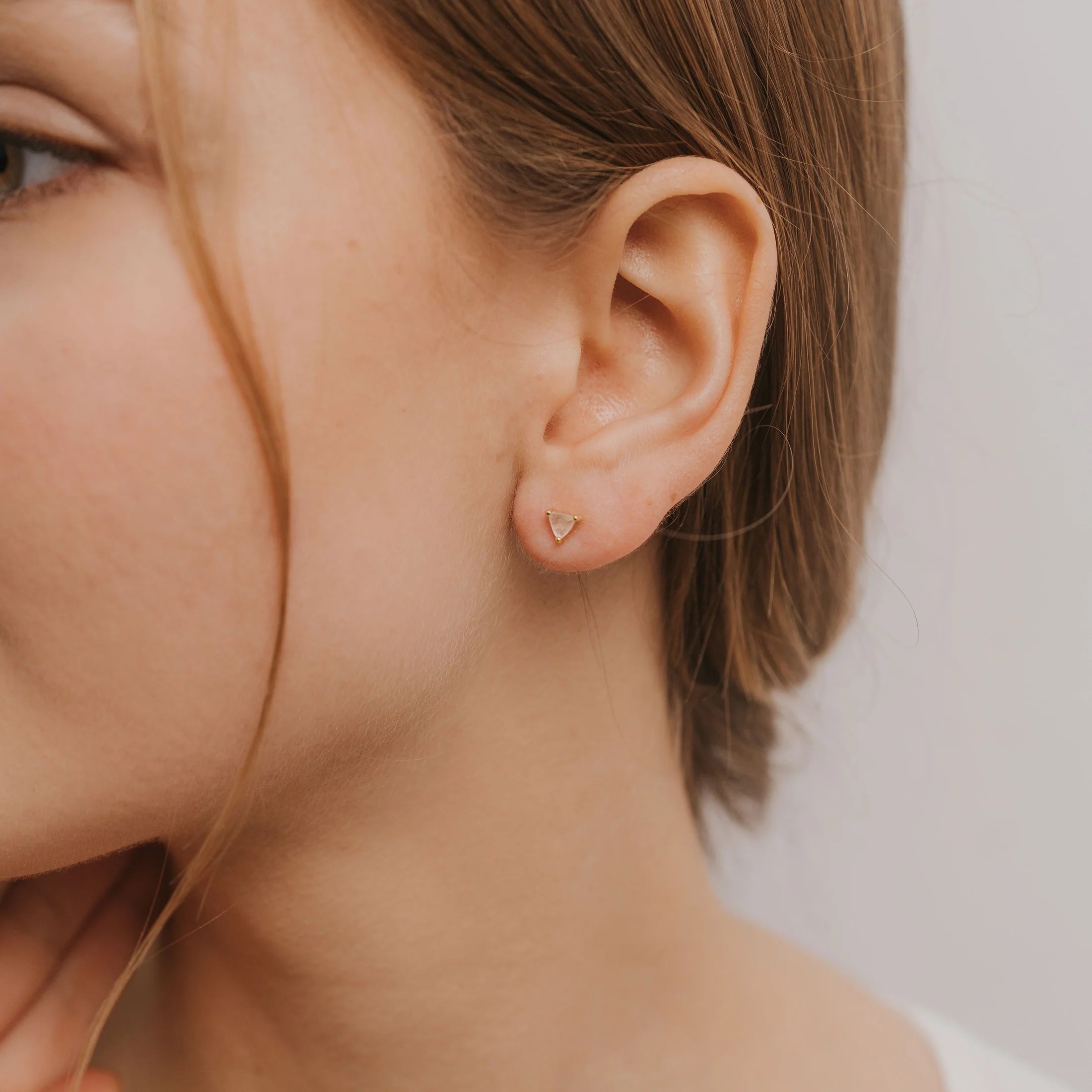 Designed in CA. The Mini Energy Gem studs feature a triangular stone set in a prong, green Onyx is know to bring love to the wearer.